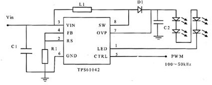 LQ035Q7D的背光電路如圖4所示。使用TI公司的TPS61042驅動4個LED燈管,同時使用PWM信號控製電壓的輸出,以調節4個LED燈管的亮度。PWM信號的控製頻率在100~50kHz之間,頻率過低,會產生閃爍。如果不使用PWM信號,可以直接連接一個GPIO引腳,設置高低電平控製LED燈的開關。