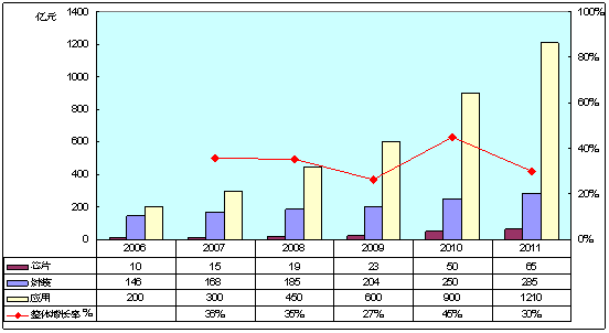 2011年,我國半導體照明產業規模達到1560億元,較2010年的1200億元增長30%。其中上遊外延芯片、中遊封裝、下遊應用的規模分別為65億元、285億元和1210億元,增速略有放緩。