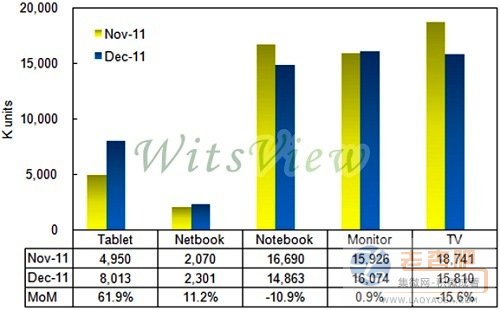 監視器麵板出貨量為1,607萬片,月增0.9%;筆記型電腦麵板出貨量為1,486萬片,月減10.9%。平板電腦方麵,WitsView指出,蘋果(Apple)新一代 iPad 3 麵mian板ban,持chi續xu受shou到dao生sheng產chan良liang率lv問wen題ti,造zao成cheng目mu前qian供gong貨huo量liang依yi然ran受shou到dao限xian製zhi,但dan華hua南nan地di區qu對dui於yu山shan寨zhai平ping板ban電dian腦nao需xu求qiu,依yi舊jiu強qiang勁jin,整zheng體ti平ping板ban電dian腦nao麵mian板ban出chu貨huo較jiao11月增加61.9%,出貨量來到801萬片。小筆電用麵板出貨量則來到230萬片,較上月增加11.2%。