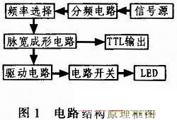 對水下成像係統而言,光源的選擇至關重要,光源的穩定性、均勻性、響應速度及其光波波長範圍是係統成像的關鍵。采用藍光LED所發出光光經過水介質——目標反射——水介質——接收光學係統,最終在成像傳感器(CCD,ICCD)上成像。這就決定了LED必須工作在快脈衝驅動方式下,目前市場上的驅動電路一般均丁作在慢脈衝驅動模式(μs量級),遠不能滿足我們的要求。因此,我們必須自己解決快脈衝驅動電路這一難題,尤其是實現以ns量級的大功率快脈衝來驅動大功率的LED。基於這種實驗實際需求,我們研究開發了此種快脈衝驅動電路。該電路的基本功能是產生低頻、快速、大功率驅動電流脈衝信號,輸出脈衝的頻率與周期精確度高,穩定性好,脈衝信號寬度在20~100 ns內分5檔可調,輸出在50 Hz的基準頻率下工作。脈衝信號通過驅動電路,輸出一個快脈衝信號驅動輸出電流開關,產生一個大電流脈衝信號驅動一個大功率LED。為了達到設計要求和目的,我們采用晶振電路產生高精度頻率/周zhou期qi基ji準zhun脈mai衝chong作zuo為wei內nei置zhi信xin號hao源yuan,通tong過guo對dui基ji準zhun脈mai衝chong進jin行xing多duo次ci分fen頻pin,產chan生sheng所suo需xu頻pin率lv的de輸shu出chu脈mai衝chong信xin號hao,這zhe樣yang可ke以yi獲huo得de頻pin率lv穩wen定ding的de脈mai衝chong信xin號hao,同tong時shi實shi現xian了le頻pin率lv選xuan擇ze。經jing過guo分fen頻pin後hou的de脈mai衝chong信xin號hao再zai經jing過guo脈mai衝chong寬kuan度du成cheng形xing電dian路lu實shi現xian脈mai寬kuan調tiao節jie,然ran後hou經jing過guo電dian流liu開kai關guan電dian路lu,產chan生sheng大da電dian流liu脈mai衝chong,使shiLED發光。該驅動電路主要由以下幾個部分組成:信號源、分頻電路、頻率選擇、脈衝寬度電路、TTL輸出、驅動電路和電流開關電路。其框圖如圖1所示。