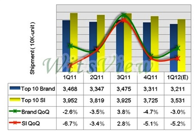 根據集邦科技(TrendForce)旗下研究部門 WitsView 最新公布的全球前十大液晶監視器出貨調查數據,2011年第四季前十大液晶監視器品牌及代工廠商出貨雙雙呈現衰退,其中品牌商出貨較上一季衰退4.7%,較2010年同期衰退約7%,而代工廠出貨則衰退5.1%,較2010年同期則明顯衰退約12%。
