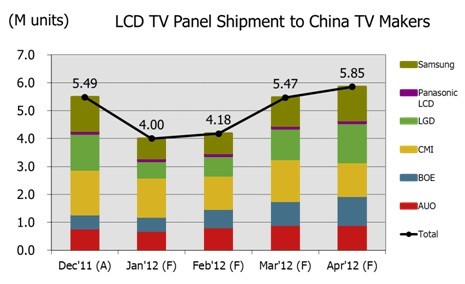 圖一、Dec’11~Apr’12電視麵板出貨至大陸電視廠商的數量