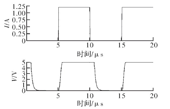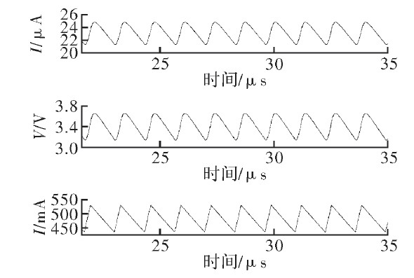 為驗證文中提出的電流采樣電路的功能,結合滯環控製電路及外部負載在Cadence中進行了仿真。圖5為輸入電壓20 V時采樣電流、電壓與負載電流的關係。由圖可見,采樣電流與采樣電壓隨負載電流同相周期性變化,周期約為1.2μs.