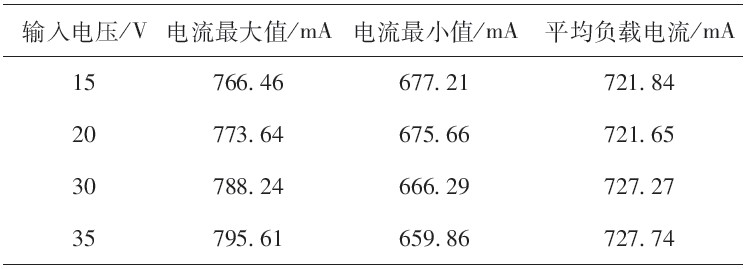 表2為不同輸入電壓下負載電流的峰-峰值。由表中數據計算,在輸入電壓由15V變化至35V的過程中,負載電流的最大誤差僅為0.81%.