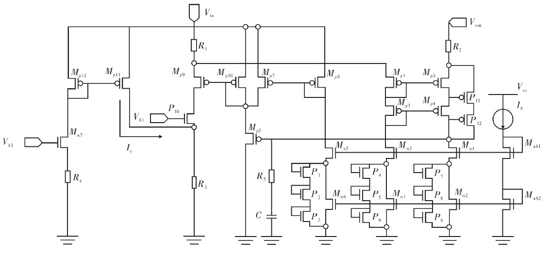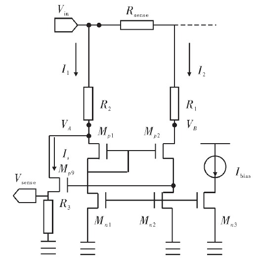 圖2是電路采樣電路結構圖。Rsense為采樣電阻,R1=R2=R;Mp1、Mp2、Mn1、Mn2組成的電壓鏡和Mp9反饋管組成匹配電流源作為電流檢測電路。其中Mp1與Mp2相互匹配並被偏置在飽和區,Mn1與Mn2是兩個相同且非常小的電流源,以保證流過Mp1與Mp2的電流相等從而使其具有相等的VSG。