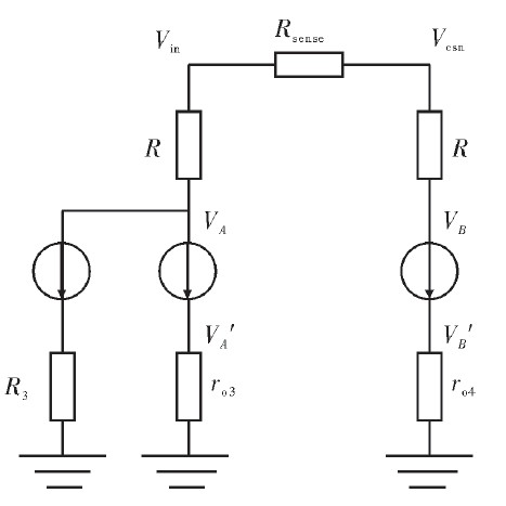 在實際電路中,VA對VB的匹配度直接影響采樣精度。圖3為簡化的小信號模型。圖4為實際電路圖。Vin與Vcsn為精確采樣電阻Rcsn兩端電壓,輸入範圍8~40 V;Vcc為芯片內部5 V穩定電源。