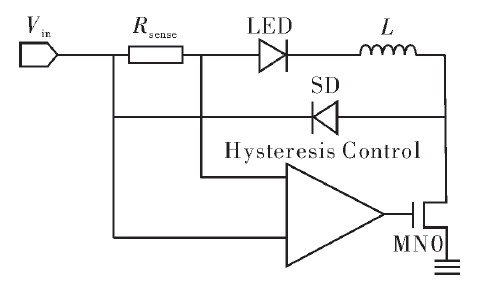 圖1是滯環控製電路框圖。LED驅動電流的變化反映在Rsense兩端的壓差變化上。滯環電流控製模塊內設兩個電流閾值Imax和Imin,當電路接上電源時,功率管打開,電源通過Rsense、負載LED向電感L充電,驅動電流上升。當電流>Imax時,控製電路輸出低電平關閉功率開關管。此時電感通過負載LED、Rsense和肖特基二極管放電,電流下降。當驅動電流<Imin時,控製電路輸出高電平打開功率開關管,重複上一個周期的動作。通過這種方式控製電路將驅動電流限製在Imax與Imin之間周期性變化,使流過LED的平均驅動電流值恒定。
