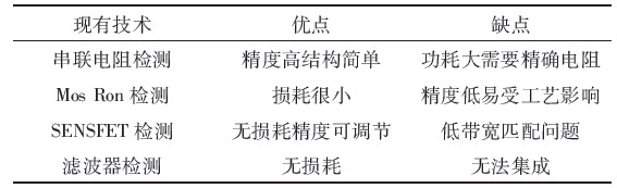 表1中列出了現有的幾種電流檢測技術並列舉了其優缺點。