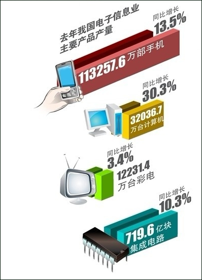 近日,工信部發布《2011年電子信息產業統計公報》,在2011年,我國彩電、手機、計算機等主要電子產品產量占全球出貨量的比重分別達到48.8%、70.6%和90.6%,均名列世界第一。