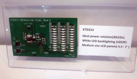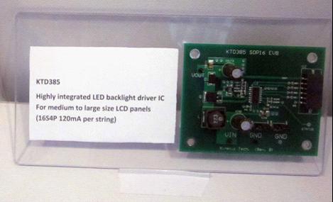 芯xin凱kai電dian子zi針zhen對dui中zhong大da尺chi寸cun顯xian示shi屏ping應ying用yong領ling域yu的de產chan品pin也ye是shi相xiang當dang的de豐feng富fu,他ta們men中zhong型xing尺chi寸cun顯xian示shi設she備bei推tui出chu了le全quan係xi列lie的de電dian源yuan管guan理li解jie決jue方fang案an及ji產chan品pin,通tong過guo這zhe些xie優you化hua的de產chan品pin可ke以yi有you效xiao提ti高gao轉zhuan換huan效xiao率lv,減jian少shao尺chi寸cun,並bing降jiang低di成cheng本ben。同tong時shi,通tong過guo工gong藝yi和he設she計ji手shou段duan的de不bu斷duan創chuang新xin,針zhen對duiLED TV和液晶顯示器的背光驅動推出了革命性的解決方案,KTD38X係列的產品就是他們將來重點推廣和生產的產品,據了解芯凱電子還會陸續推出38X係列更高性能能和高品質的應用於3D液晶顯示器的背光驅動產品。