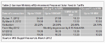 對於2012和2013年,德國政府確認的年度安裝目標是2.5-3.5GW,從2014年開始,該目標將每年下調400MW。表2所示為德國環境部所建議的FIT體係。