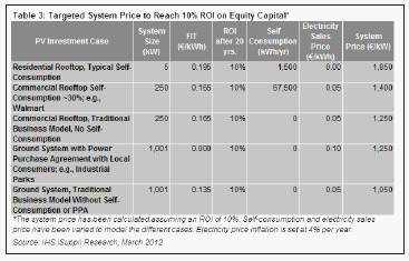 在FIT調整之後,IHS iSuppli公司的計算結果顯示,如果係統價格為1850歐元/kW,即使取消自我消費獎勵,德國住宅係統仍能達到10%的股本(20%)投資回報率。由於德國市場的價格已經降到這樣的水平,住宅領域將繼續提供有吸引力的投資條件,盡管政府降低FIT。
