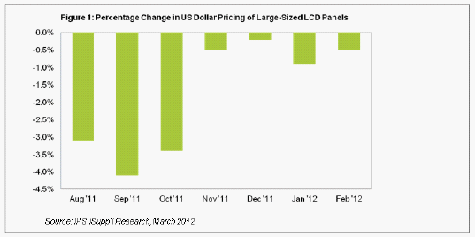 同時,一些麵板廠商報告稱2月產量增加,盡管去年泰國洪災導致的硬盤短缺將在2012年上半年影響監視器和筆記本電腦的生產。監視器和筆記本電腦是大尺寸液晶麵板三個應用領域中的兩個。