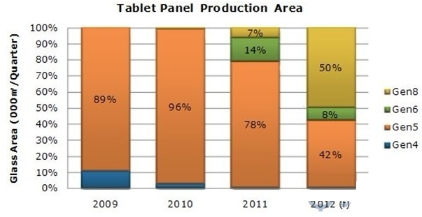根據最新一季的季度大尺寸麵板生產策略報告(Quarterly Large-Area Production Strategy Report)指出,在2011年前五代線為生產平板電腦麵板(9”以上)麵積最大的主要產線。然而,在2012年八代線將成為平板電腦麵板最主要的生產工廠。