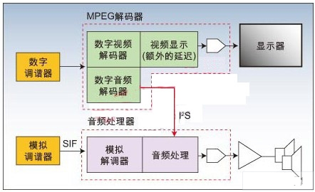 在(zai)從(cong)模(mo)擬(ni)電(dian)視(shi)向(xiang)數(shu)字(zi)電(dian)視(shi)轉(zhuan)變(bian)的(de)過(guo)程(cheng)中(zhong),電(dian)視(shi)機(ji)也(ye)需(xu)要(yao)能(neng)夠(gou)同(tong)時(shi)處(chu)理(li)模(mo)擬(ni)和(he)數(shu)字(zi)音(yin)頻(pin)。模(mo)擬(ni)電(dian)視(shi)信(xin)號(hao)中(zhong)的(de)音(yin)頻(pin)要(yao)使(shi)用(yong)一(yi)個(ge)子(zi)載(zai)頻(pin),而(er)模(mo)擬(ni)調(tiao)諧(xie)器(qi)通(tong)常(chang)有(you)一(yi)個(ge)需(xu)要(yao)被(bei)解(jie)調(tiao)的(de)聲(sheng)音(yin)中(zhong)頻(pin)(SIF)輸出。DTV平台通常有一個用於解調來自模擬調諧器的SIF輸出的模擬輸入端和一個來自解碼器的數字輸入端,後麵的解碼器用於處理MPEG數據流中的視頻和數字音頻(圖2)。