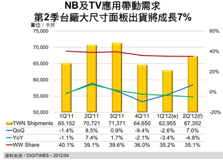2012年第2季台廠大尺寸(9寸以上)TFT LCD麵板總出貨量將為6,735.2萬片,較前一季增加7%,但較2011年同期則減少4.8%,DIGITIMES Research資深分析師兼副主任黃銘章分析,主要原因為彩晶及華映相繼地淡出大尺寸麵板市場,2011年華映的各類NB麵板出貨達到664萬片,但2012年將降至不足100萬片。因此,預期台廠佔全球出貨量比重在第2季仍將微幅下跌0.1個百分點至35.1%。