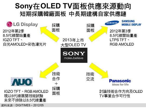 2012年下半至2013年南韓兩大麵板廠商因具備大尺寸OLED TV麵板量產能力,且Sony具備龐大LCD TV麵板采購力(2011年占全球10%)可作談判籌碼,因此黃銘章預期,南韓麵板廠尤其是Samsung麵板事業,將會供應給Sony所需麵板;但中長期而言,南韓三星與LG與Sony在電視市場針鋒相對,因此Sony仍會希望建構自家供應鏈,此時,具備OLED技術及大尺寸TFT產能可供轉換為OLED生產線的友達,將較有機會打入Sony OLED TV的供應鏈中。