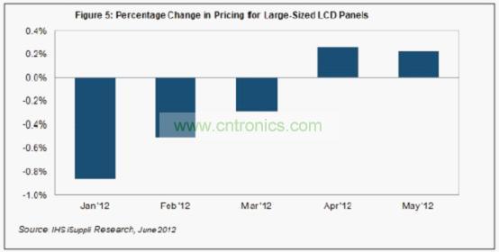 據IHS iSuppli公司的液晶顯示器(LCD)報告,廠商繼續謹慎控製產量和庫存,以抵消電視、監視器和筆記本電腦等主要應用領域的疲弱需求,5月大尺寸LCD麵板價格微漲。