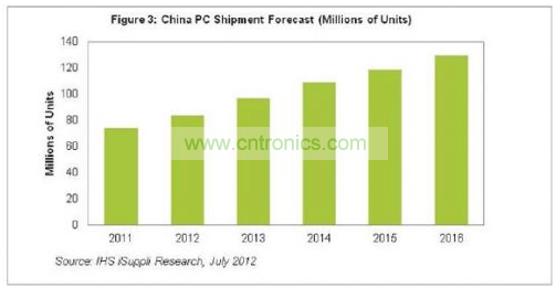 2012年中國市場的PC出貨量預計達到8360萬台,比去年的7390萬台增長13%。至少從2008年以來,中國台式電腦與筆記本的國內出貨量一直保持兩位數的強勁增長,預計這種健康勢頭還將再保持兩年,直到2015年溫和放緩至9%。