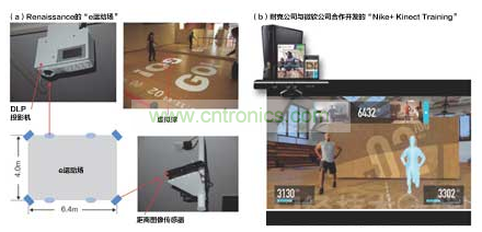 (a)是Renaissance經營的健身俱樂部設置的“e運動場”。使用投影儀把遊戲畫麵投影投影到訓練館中,用戶親身參與其中。人體動作使用距離圖像傳感器獲取。照片上是2位運動員相對而立,向對方球門射出虛擬球的“空氣曲棍球”遊戲。(b)是耐克公司與微軟公司合作為“Xbox 330”開發,支持Kinect的健身軟件“Nike+Kinect Training”的畫麵示例。該軟件將檢測身體的動作,為目標提供有效訓練方式。