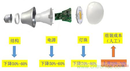 從上圖表示,LED光源產品無論是從結構,電源還是燈珠,成本都有大幅下降至少50%,然而人工組裝成本卻漲幅近20%-30%。晶豐明源銷售總監李寧在第六屆華強國際LED照明市場戰略暨創新技術研討會上表示:“晶(jing)豐(feng)明(ming)源(yuan)將(jiang)持(chi)續(xu)提(ti)供(gong)更(geng)高(gao)性(xing)價(jia)比(bi)的(de)整(zheng)體(ti)電(dian)源(yuan)方(fang)案(an)來(lai)提(ti)高(gao)客(ke)戶(hu)的(de)競(jing)爭(zheng)力(li),其(qi)次(ci),實(shi)現(xian)全(quan)自(zi)動(dong)化(hua)生(sheng)產(chan),提(ti)高(gao)效(xiao)率(lv),從(cong)而(er)幫(bang)助(zhu)客(ke)戶(hu)降(jiang)低(di)人(ren)工(gong)成(cheng)本(ben)。”