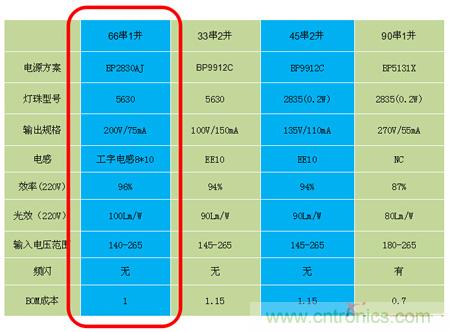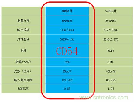 從(cong)上(shang)圖(tu)各(ge)種(zhong)參(can)數(shu)對(dui)比(bi)我(wo)們(men)可(ke)以(yi)看(kan)出(chu),單(dan)從(cong)成(cheng)本(ben)來(lai)看(kan),一(yi)定(ding)是(shi)線(xian)性(xing)方(fang)案(an)最(zui)低(di),但(dan)同(tong)時(shi)會(hui)存(cun)在(zai)一(yi)些(xie)問(wen)題(ti),比(bi)如(ru)光(guang)效(xiao),效(xiao)率(lv)並(bing)不(bu)是(shi)很(hen)理(li)想(xiang),最(zui)關(guan)鍵(jian)的(de)一(yi)點(dian),線(xian)性(xing)方(fang)案(an)溫(wen)度(du)較(jiao)高(gao),因(yin)為(wei)鋁(lv)基(ji)板(ban)溫(wen)度(du)高(gao)而(er)造(zao)成(cheng)的(de)硫(liu)化(hua)而(er)存(cun)在(zai)一(yi)定(ding)的(de)風(feng)險(xian)。所(suo)以(yi),從(cong)整(zheng)體(ti)參(can)數(shu)對(dui)比(bi)來(lai)看(kan),66串1並的方案是性價比最高的。同理,8W T管方案推薦的是單串1並BP9918B的方案,單片集成工藝,集成啟動電阻,極簡的外圍電路,係統成本極具競爭力,其中值的一提的是該方案采用了CD54電感,可將BOM成本可以做到大概在0.85左右,且可以實現全貼片的方案,從而幫助客戶降低人工成本。