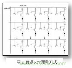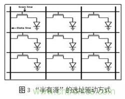 而第三種“半有源”驅qu動dong雖sui然ran可ke以yi較jiao好hao地di避bi免mian像xiang素su之zhi間jian的de串chuan擾rao現xian象xiang,但dan是shi由you於yu其qi像xiang素su電dian路lu中zhong沒mei有you存cun儲chu電dian容rong,並bing且qie每mei一yi列lie的de驅qu動dong電dian流liu信xin號hao需xu要yao單dan獨du調tiao製zhi,並bing不bu能neng完wan全quan達da到dao上shang麵mian列lie出chu的de有you源yuan選xuan址zhi驅qu動dong方fang式shi的de全quan部bu優you勢shi。