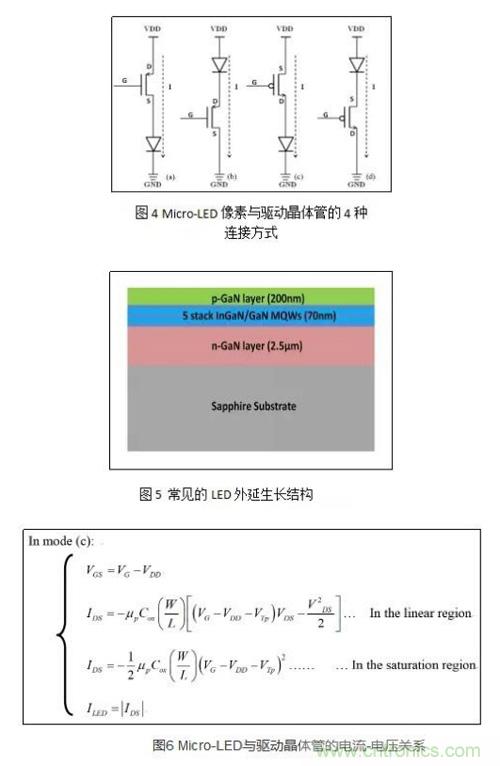 圖4(a)中Micro-LED像素連接在N型驅動晶體管的源極(Source)。由外延生長(Epitaxial Growth)、製備工藝、及器件老化所產生的不均勻性所導致的Micro-LED電學特性的不均勻性將會直接影響驅動晶體管的VGS,從而造成顯示圖像的不均勻。而圖4(c)中的Micro-LED像素連接在P型驅動晶體管的漏極(Drain),可以避免上述影響,其電流-電壓關係圖6所示。因此,有P管像素電路驅動Micro-LED較為適宜。