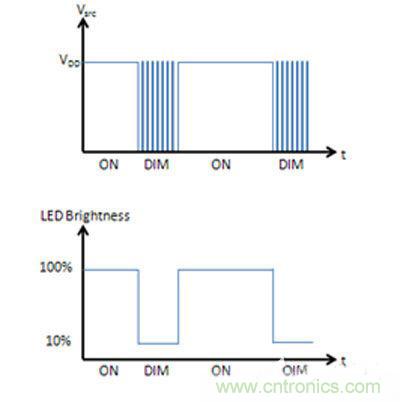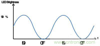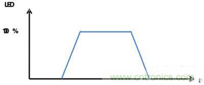 我們在本文開始處通過筆記本電腦的電源鍵為例簡單介紹了一下呼吸效應。持續地逐漸提升或逐漸下降兩級之間的占空比能讓LED形成“呼吸”的效果,如圖6所示。待機模式下電源按鍵支持呼吸效應能告訴用戶電源按鍵是活動狀態並能進行操作。