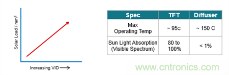 為了更好地理解為什麼散射屏具有優勢,我們不妨來看看散射屏與傳統TFT麵板的物理特性(圖4)。散射屏具有的兩大主要優勢在於可在更高的溫度中工作,此外散射屏不會吸收大量的太陽入射可見光譜,這一點更加重要。(光譜的紅外[IR]和紫外[UV]部分很容易被過濾。)