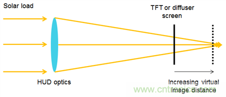 圖 2:HUD光學器件將太陽能負載放大到散射屏或薄膜晶體管(TFT)麵板上