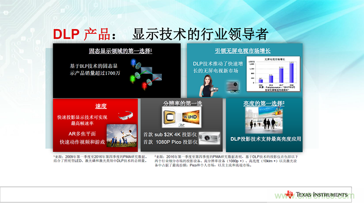 “在顯示應用領域,DLP技術涵蓋範圍非常廣,從小巧的口袋型顯示器到高端大型的數字影院,TI一直保持大量的產品和技術創新。”Ane Sacks女士在會議中介紹到,“如今,TI已經能夠實現最高幀速率和最高亮度的快速投影顯示技術,麵向快速動作視頻和遊戲市場;在麵板分辨率上推出了入門級的4K平台,與此同時在1080P上也有十足的創新,推出了超高性價比的1080p Pico解決方案,未來市場潛力巨大。”