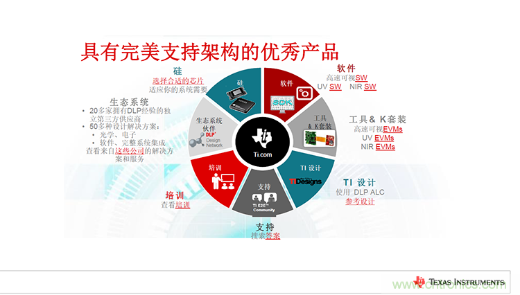 “為加速滲透民用主流市場,TI不僅推出了性能優異的產品,還建立了一流的支持架構,以借助廣大TI用戶加快產品麵市。”Ane Sacks女士還表示,“針對TI的IC和DLP芯片組,TI可以提供軟件、工具套件、參考設計、工程社區交流、技術培訓以及完善的DLP生態係統等技術支持,包含20多家擁有DLP經驗的獨立第三方供應商以及50多種光學、電子、軟件等方麵的設計解決方案,能夠將最新的創新、產品和應用及時、快速地傳遞給客戶。”