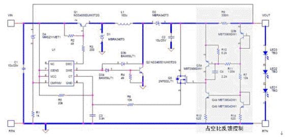 除了單純的降壓或升壓拓撲結構,在某些環境下,也需要降壓-升壓拓撲結構,如從標準電源輸入端驅動LED串;此外,在輸入電壓和LED負載電壓交疊的場合中使用這種拓撲結構也很常見。而NCP3065也能夠配置為降壓-升壓控製器。這種架構需要2個電源開關。雖然NCP3065本身也包含1個電源開關,但我們可以使用1個低VCEsat PNP/NPN對(dui)管(guan)來(lai)獲(huo)得(de)更(geng)高(gao)轉(zhuan)換(huan)效(xiao)率(lv)。這(zhe)是(shi)一(yi)種(zhong)可(ke)擴(kuo)展(zhan)的(de)方(fang)案(an),整(zheng)流(liu)器(qi)和(he)電(dian)源(yuan)開(kai)關(guan)都(dou)能(neng)夠(gou)根(gen)據(ju)具(ju)體(ti)的(de)輸(shu)入(ru)和(he)輸(shu)出(chu)電(dian)壓(ya)以(yi)及(ji)電(dian)流(liu)電(dian)平(ping)來(lai)調(tiao)整(zheng)。值(zhi)得(de)一(yi)提(ti)的(de)是(shi),諸(zhu)如(ru)NSS40500UW3這樣的低VCEsat晶體管采用小巧的2×2 mm封裝,提供極佳的性能。