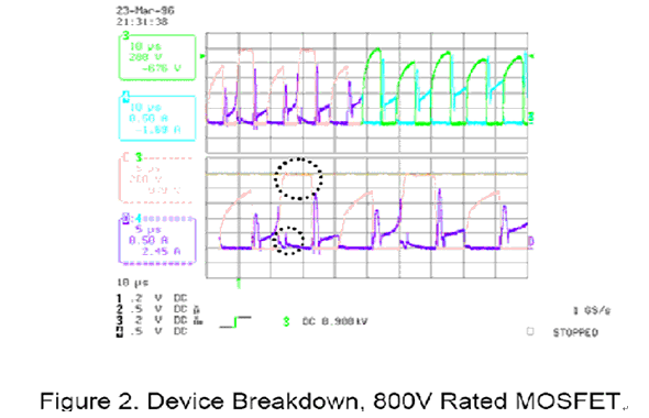 當場效應晶體管進入崩潰效應時 Drain 及 Source 電壓會被嵌製在其崩潰電壓 , 而電流會經由寄生的二極管而產生逆向操作電流的現象。如圖二所示為一典型開關式電源電路所量測到的崩潰現象。從圖中可看出 Drain 及 Source 的電壓 (CH3) 被箝製在 1KV 而且逆向電流 (CH4) 可清楚地被發現。