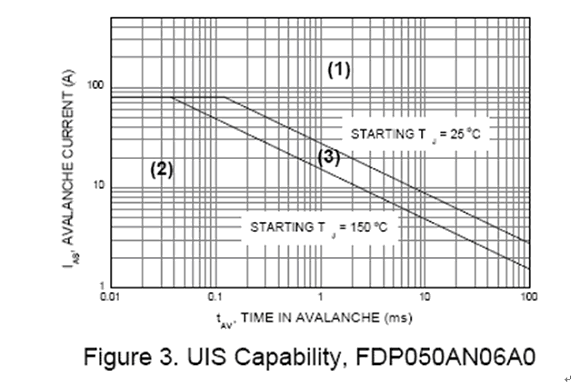 UIS 的評估方式是針對崩潰現象分析的一種很有用的方法。在圖三 UIS 安全工作區域中可區分為三大區域 (1) 大於 25 ° C 線或者是圖中靠右的區域 , (2) 低於 150 ° C線或者是圖中靠左的區域 , (3) 介於 (1) 與 (2) 的區域。其中 (1) 可清楚地了解此組件工作超出額定工作範圍之外 (2) 則是位於額定工作範圍之內。至於 (3) 的區域界定 我們需要得到此組件的起始 UIS 接合麵溫度以決定其工作能力。稍後會在後麵舉例說明如何求出此接合麵溫度。