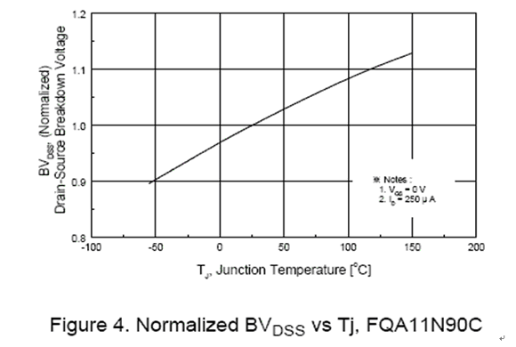 一般而言 假使 Drain 及 Source 電壓超過規格書所載明的最大額定電壓稍大一些 , 此時要讓場效應晶體管產生崩潰現象其實是不常發生的。圖四所表示的曲線為場效應晶體管的額定最大工作電壓 (BVDSS) vs 接合麵溫度 (Tj), 其特性的表示是以正溫度特性變化 。當接合麵溫度達到 120 ° C 時 , BVDSS 可達到將近 990V 。由此可知 , 在更高的接合麵溫度條件下 , 場效應晶體管需要更高的 Drain 對 Source 的電壓以達到崩潰效應產生的必要條件。