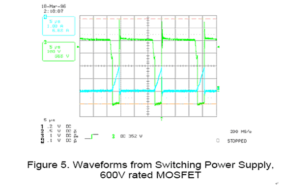 但這裏必須提醒一件事 , 圖四所標示的 BVDSS 是基於 250uA 的 ID 電流為條件所定義。在實際崩潰發生時 ID 電流遠大於 uA 的範圍。 因此 , 所欲達到的崩潰電壓也會比上述圖四中所推導的電壓要來的大的多。就實際的考量而言 , 場效應晶體管的實際崩潰電壓一般是額定低電流崩潰電壓的 1.3 倍。以圖五為例 , 它所表示的是一個超過最大額定電壓但並未進入崩潰現象的波形 ,Drain-Source 的電壓已達到 668V > 600V 但並未嵌製於崩潰效應。
