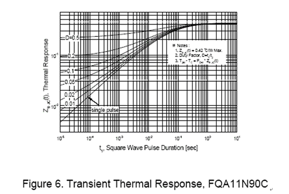 舉例說明 , 當一個 2KW 的電源脈衝加至 FQA11N90 的脈衝時間為 1uS 時 , 我們可依據圖六的曲線算出此脈衝功率對接合麵所產生的溫升為