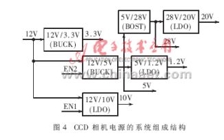在目標相機中:運放電路需要28V@30mA、CCD芯片中的VSFD需要 20V@50mA、光生電荷從圖像感光區→圖像存儲區、圖像存儲區→像元輸出隊列需要10V@100mA、像元從像元隊列輸出需要5V@20mA、MCU、FPGA和LVDS的工作電壓需要3.3V@ 300mA和1.2V@30mA共六檔直流穩壓電源。