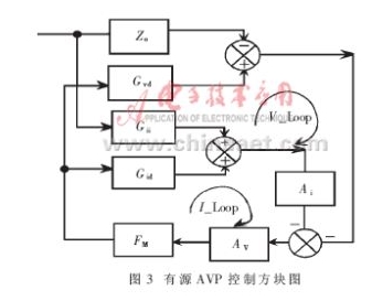 AVP有源控製為雙環控製,其基本原理如圖2所示。通過檢測電感電流,根據降壓要求相應調節輸出電壓的基準。輸出電壓跟隨基準電壓而實現AVP控製。圖3為AVP有源控製的方塊圖,假設電流環增益為Ti,電壓環增益為Tv,則: