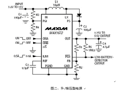 設計者也可以直接用一組Buck/Boost電源IC產生所需要的電壓輸出, 圖二便是一組直接升/降壓轉換IC。它ta結jie合he了le一yi組zu升sheng壓ya轉zhuan換huan器qi和he線xian性xing穩wen壓ya器qi,提ti供gong既ji可ke以yi升sheng壓ya,也ye可ke以yi降jiang壓ya的de轉zhuan換huan方fang案an。這zhe個ge轉zhuan換huan器qi在zai輸shu入ru電dian壓ya高gao於yu或huo低di於yu輸shu出chu電dian壓ya時shi能neng夠gou提ti供gong一yi個ge穩wen定ding的de輸shu出chu,允yun許xu輸shu入ru範fan圍wei:1.8V至11V,可預置為3.3V或5V輸出,也可以使用兩個分壓電阻得到可調節的輸出電壓:1.25V至5.5V,效率可達85%。如果需要3.5V至4V之間的輸出,可以用升壓轉換器與線性穩壓器相組合的方式實現。如:MAX1606升壓轉換器與MAX8512線性穩壓器的組合。