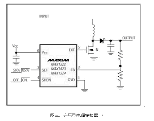 有些設計者為了追求較高的轉換效率, 選擇了升壓方式,產生一組高於輸入的穩定輸出, 如圖三的升壓架構。由於功率開關MOSFET是外置的, 可提供較大的輸出功率。在輸出功率許可的條件下,也可以選擇內置MOSFET功率開關的升壓轉換器,如MAX1722, 可有效節省空間、降低成本。