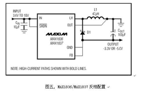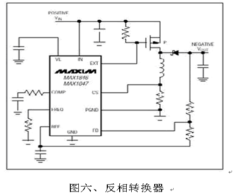 也可以選擇負電壓輸出轉換器, 圖六便是常用的PWM負壓轉換器, 外部元件少、設計簡易, 工作在固定頻率的PWM結構幹擾較小。