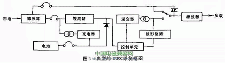 UPS不問斷電源是個特殊的設備,它既是電網的負載,又要給負載提供電源。所以它的EMC設計既要保證它不對電網造成電磁汙染,又要保證它提供給負載的是個幹淨的電源。UPS本身振蕩電路就是一個幹擾源。典型的UPS係統框圖如圖l所示。它的基本結構是一套將交流市電變為直流電的整流器、充電器和把直流電再變為交流電的逆變器,電池在交流正常供電對儲存能量且維持在一個正常的充電電壓上.一旦市電中斷,蓄電池立即對逆變器供電 保證UPS交流輸出。