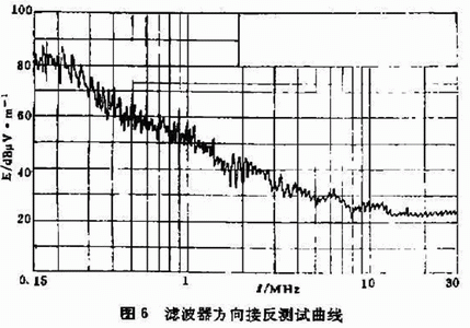 通常EMI濾波器的電路是無源網絡,具有其互易性,但從實際測試中了解到,有些濾波器輸入輸出端命名是針對幹擾源而言的.有些命名是針對電路而言的。因此,在抑製幹擾能力上就稍有差別 從圖6和圖7可以清楚地看出,濾波器反接時.對低頻幹擾抑製減弱,從而使UPS係統內部幹擾信號竄入電源線,而引起超差.經轉向後,就合格了。
