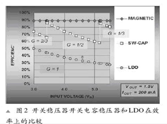 隨著VIN的增長,由轉換器產生的VIN和VOUT 間jian的de增zeng量liang增zeng長chang引yin起qi功gong率lv消xiao耗hao的de增zeng長chang和he效xiao率lv的de下xia降jiang。解jie決jue這zhe個ge問wen題ti的de一yi個ge方fang式shi是shi轉zhuan變bian成cheng一yi個ge更geng高gao的de效xiao率lv增zeng益yi,就jiu像xiang給gei汽qi車che替ti換huan齒chi輪lun一yi樣yang。圖tu2顯示了一個開關電容器降壓穩壓器,一個LDOjiyigekaiguandianrongqidexiaolvquxian。kaiguandianrongqijuyouyigemonizengyikongzhihezengyibianhuayibaochiyigegeidingfuzaixiaolvdechixuxing。kaiguandianrongqibingjuyoulisanzengyibuzhou,youVOUT/(增益 *VIN)與離散增益來決定效率的高低。一個LDO僅有1的增益及三者中最低的效率。開關電容器(SC)穩壓器則有三個不同的電壓增益(2/3,1/2和1/3)。我們可以看到,開關電容穩壓器隨著VIN 的增長,電壓增益從2/3轉到1/2以及從1/2到1/3,因此整個負載範圍的效率達到最大化。這就帶來了在Li-ion 範圍上(3.4V到3.8V)80%的效率。在相同應用中的一個LDO僅能達到50%的效率。根據電感器種類,一個典型的開關穩壓器大約具有88-90%的效率。