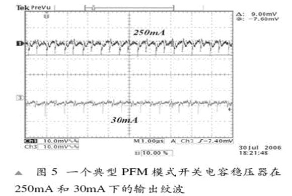 在PFM類係統中,可以感應到輸出電壓,當這個電壓高於一個指定值時,穩壓器就會關閉,等到輸出電壓降到所需值以下時再重新開啟。使用PFM控製模式的缺點是工作頻率取於VIN 和 ILOAD ,因此變化不定。負載越高、工作頻率就越接近指定頻率。這個操作範圍上的頻率變化在一些便攜式應用中可能不大合適。輸入電壓紋波也取決於VIN 和 ILOAD。圖5顯示了250mA 和 30mA 負載的輸出紋波。10mF COUT 的輸出紋波將為50mV,我們可以看到250mA負載的紋波頻率高於10mA負載的紋波頻率。