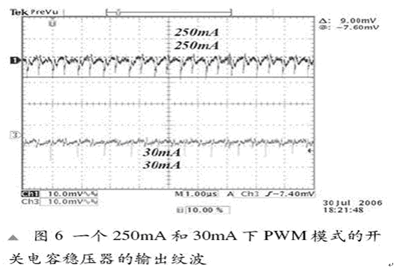 比較新的PWM調控模式處理了PFM架構中的各種頻率和高輸出紋波。大多數的新型開關電容穩壓器都采用PWM調製模式。在這種模式下,功率FET的電阻根據VOUT 和 ILOAD進行控製。這樣做,我們就真正控製了快速電容器(CFLY)所提供的充電量。這也被稱為預調製。在這種模式下,操作頻率和工作周期都是固定的。一個PWM架構的例子是LM2771,圖6顯示出它的輸出紋波。它處於一個帶有4.7mF COUT 的8mV -10mV的順序中。我們可以看到在ILOAD變化的情況下紋波可以持續。一個9mV的紋波輸出可以與在感應開關穩壓器中的紋波相媲美。