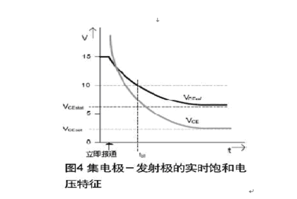 使用信號變壓器(脈衝變壓器)不僅可以提供高質量的電氣隔離,它在原邊與副邊間還有很高的dv/dt(50kv/us)。與光耦構成的驅動電路不一樣的是,信號變壓器可靠性好,號電路通道被互鎖,直到有複位脈衝對該電路進行複位。在IGBT退飽和監視中,必須考慮它的實時飽和電壓特征。在IGBT開通的最初幾個微秒,集電極-發射極電壓遠高於穩定後的VCEsat值。因此監測電路的響應特征在消隱時間內(圖4)必須與VCEsat特征圖一致。